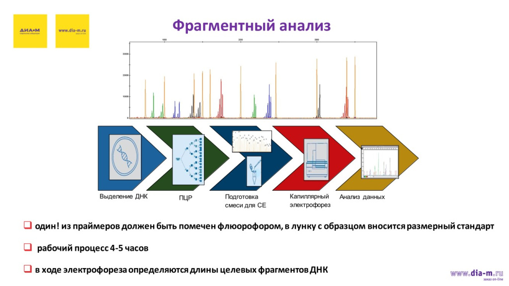 Рабочий процесс в этом случае покороче ввиду того, что включает только один этап ПЦР, кроме того – часто при фрагментном анализе можно пренебречь этапами очистки, если есть достаточно читаемый образец. Иногда его нет, и тогда приходится проводить доочистку того, который есть в распоряжении, но это увеличение продолжительности при этом не критично.