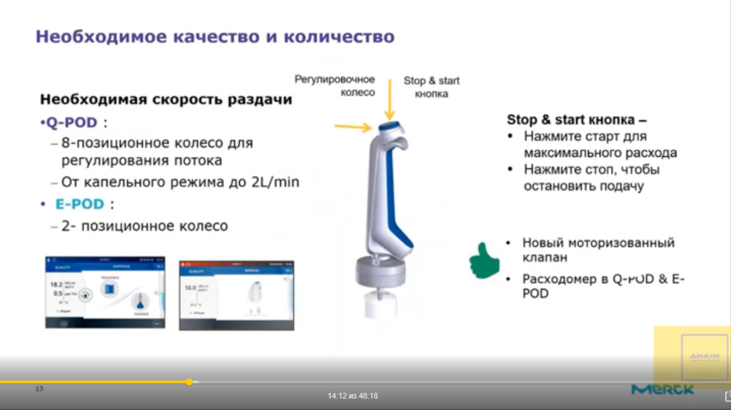 Поэтому на точке отбора систем Milli-Q создан специальный диспенсер, который показан на слайде, удобный для ручного и автоматического отбора.