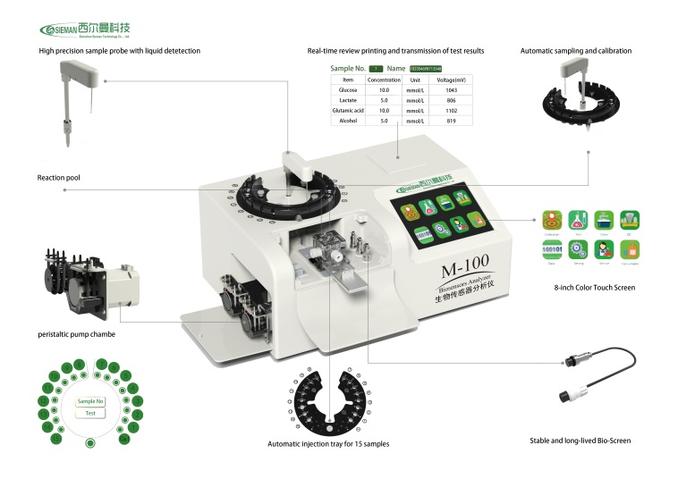 Определение содержания глюкозы основывается на электрохимическом методе анализа. β-D-глюкоза, содержащаяся в пробе, с помощью фермента глюкозоксидазы распадается до глюконовой кислоты и перекиси водорода. Перекись водорода регистрируется электродом. Электрический ток (пропорционален концентрации глюкозы) преобразуется в постоянное напряжение и измеряется аналогово-цифровым преобразователем. После каждого анализа электрод очищается системным раствором, при этом удаляются остатки пробы.