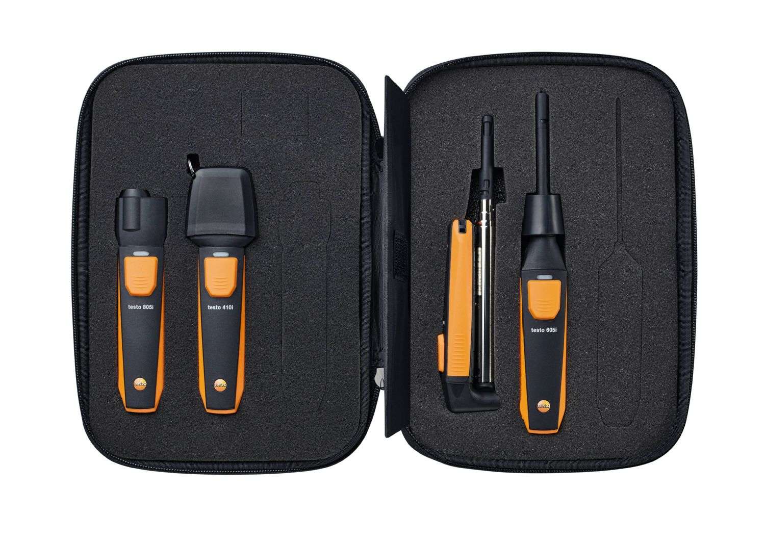 Для измерения температуры воздуха и поверхности, влажности, скорости потока и объемного расхода воздуха. Комплект смарт-зондов для систем вентиляции, включающий термоанемометр testo 405i, анемометр с крыльчаткой testo 410i, термогигрометр testo 605i и ИК-термометр testo 805i, управляемые со смартфона/планшета, идеален для специалистов по системам вентиляции для решения основных измерительных задач.