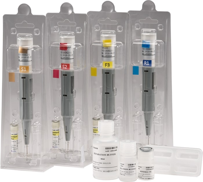 Электрофорез в Qsep происходит в картриджах разных типов, предназначенных для разделения ДНК, РНК и белков. Картридж рассчитан на анализ 100-1200 образцов (100-300 форезов, зависит от типа прибора). В комплект поставки входят все необходимые расходные материалы для электрофореза — буфер для разделения, буфер для разведения образцов, пробирки в стрипах, ванночки и пипетки для буфера, выравнивающий маркер.