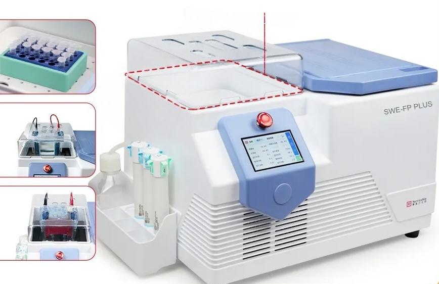 Высокопроизводительный гомогенизатор SWE-FP позволяет за одну минуту обрабатывать до 192 образцов используя широкий выбор адаптеров для пробирок различного объема от 0,5 до 50 мл, а также для 96-луночных планшетов. Температурный режим (до -50 ℃) за счет компрессорам создает благоприятные условия для снижения деградации образцов белков и НК. На борту прибора имеется охлаждающий столик для предварительного охлаждения и хранения образцов, а также проведения электрофореза, блоттинга или каких-либо других экспериментов. Модель создает высокоскоростное вертикальное возвратно-поступательное движение, при котором замороженный образец в пробирке сталкивается с шариками, полностью разрушая образец.