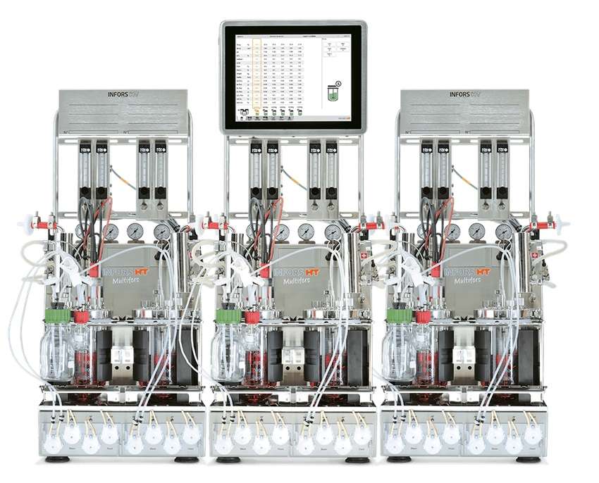 Multifors имеет два реакционных сосуда в одном базовом блоке и предназначен для параллельных экспериментов по подбору и оптимизации питательных сред, процессов культивирования, масштабированию культуры и скринингу клеточных линий и штаммов и т.п. Базовые блоки можно объединять для проведения параллельных экспериментов в 6-ти сосудах. Блоки можно объединять или разъединять, в зависимости от задач. Занимаемое биореактором пространство на рабочем столе с 6-ю сосудами всего 1,2 метра. Конструкция ферментера обеспечивает легкий доступ для технического обслуживания.