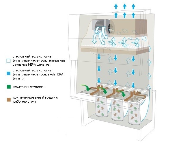 - равномерный, ламинарный, однонаправленный поток воздуха поступает на рабочую поверхность со скоростью 0,32 м/с и минимизирует кросс-контаминацию;
