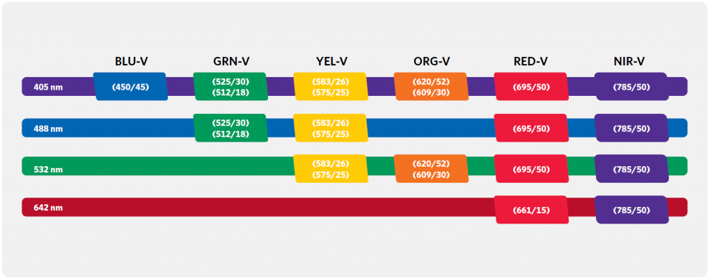 Система детекции позволяет работать как с самыми популярными красителями (FITC, Alexa 488, PE, PI), так и тандемными красителями (PE-Texas Red, PE-Cy5, PE-Cy5.5, PE-Cy7), что позволяет реализовать простые мультиплексные эксперименты.