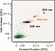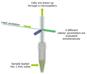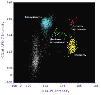 • параметры: прямое светорассеяние, два параметра флуоресценции;