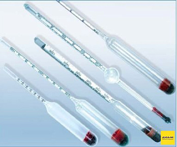 Ареометры — это устройства, применяемые для измерения показателей плотности жидкости, принцип работы которого основан на законе Архимеда. Плотность жидкостей зависит от температуры, поэтому измерения концентрации должны проводиться при строго определенной температуре, для чего используют термометр.