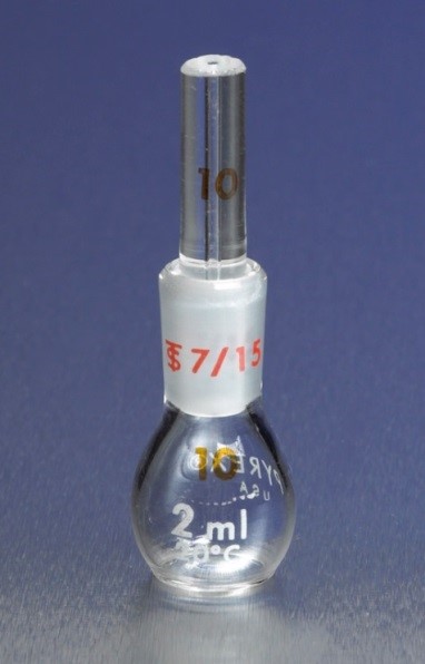 Пикнометр — это стеклянный сосуд определённой формы, который используется для определения плотности веществ. Пикнометр предварительно взвешивается на точных весах, затем исследуемое вещество помещается в пикнометр до определенной метки (объёма). Пикнометр с веществом взвешивается повторно, расчёт плотности производится путём деления массы исследуемого вещества на его объем.