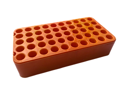Цельнолитой штатив изготовлен из пластика с лунками, в которые помещаются пробирки/контейнеры, отличается высокой механической прочностью (ударопрочный пластик) и устойчивостью к воздействию химических реагентов. Благодаря своей конструкции штативы легко и прочно штабелируются, обеспечивая экономию пространства при хранении. Особенно подходит для компактного хранения резервных копий образцов. Блочный штатив удобно дезинфицировать, благодаря сквозным отверстиям в каждой лунке. Подлежит автоклавированию.