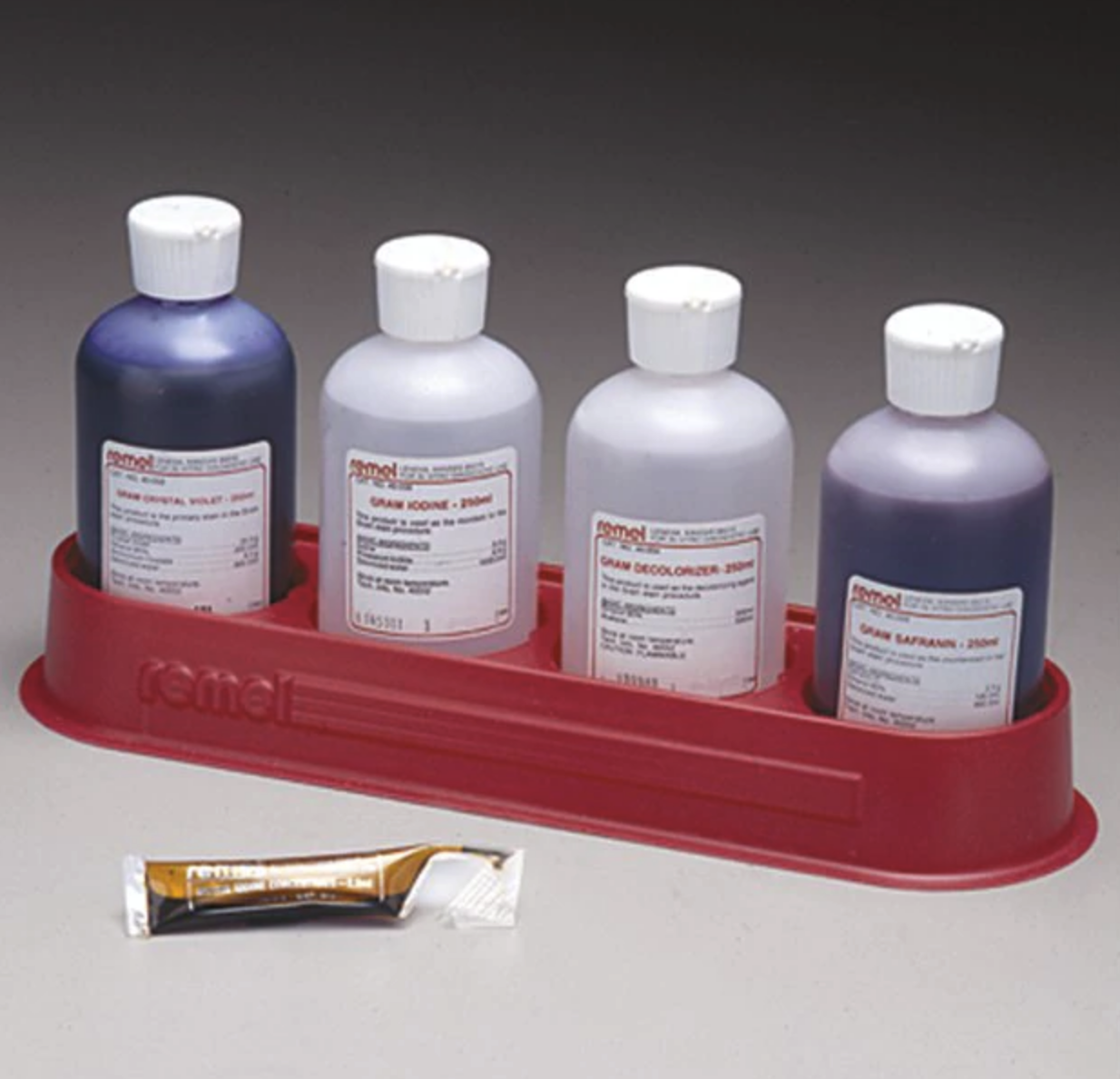 В состав комплекта входит: кристально-фиолетовый, обесцвечивающее средство, йод; сафранин; пластиковый поднос.