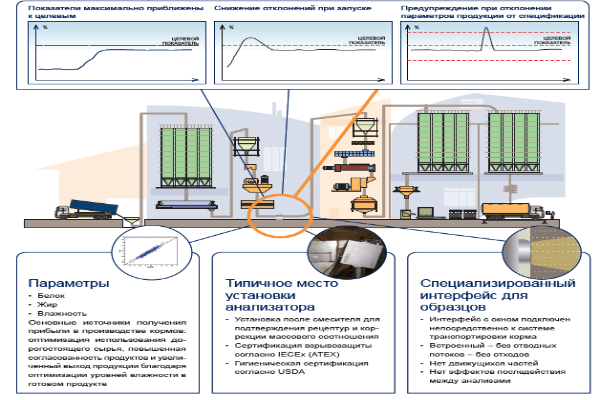 Рассмотрим альтернативное классическим методам анализа решение: поточный анализатор кормов ProFoss 2, Foss (Рис. 2.), встраиваемый в технологическую линию сенсор, тщательно контролирующий основные параметры сырьевых компонентов кормов, такие как влажность, содержание жира и протеина в реальном режиме времени.