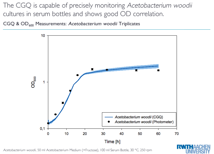 CGQ позволяет получить глубокую кинетику роста биомассы с высокой точностью, разрабатывать и совершенствовать биологические процессы на основе детальных кривых биомассы.
