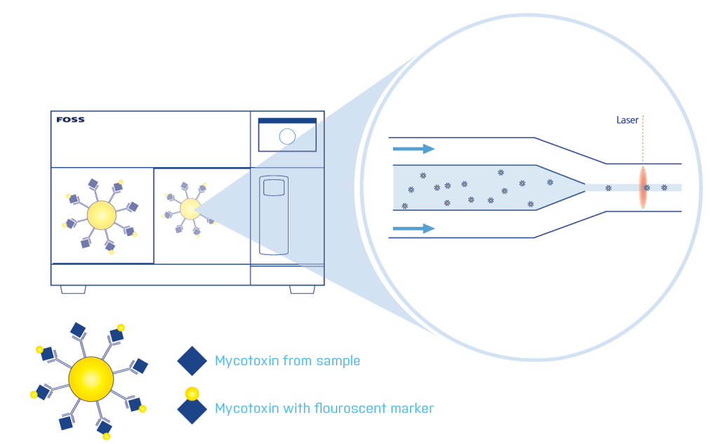 MycoFoss сочетает в себе хорошо известные технологии в инновационном формате. Решение основано на конкурентном иммуноанализе, в котором антитела, связанные с флуоресцентными микрогранулами, анализируются с помощью проточной цитометрии. Реагент для анализа включает микотоксины, отмеченные флуоресцентной молекулой. Эти «маркеры» притягиваются к антителам. Аналогичным образом притягиваются и микотоксины из образца. Затем проточная цитометрия выявляет концентрацию микотоксинов относительно количественного определения, обеспечиваемого маркерами: чем сильнее флуоресцентный сигнал, тем меньше присутствие микотоксинов в образце.