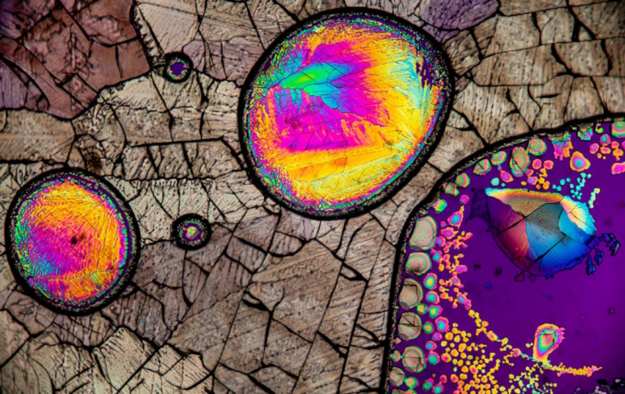 Основные компоненты поляризационного микроскопа и его особенности работы в проходящем светеАнизотропия и двойное лучепреломление. Многие органические и неорганические вещества, а также биологические объекты обладают анизотропией, то есть разными свойствами (в частности оптическими) в разных направлениях. Это проявляется в двойном лучепреломлении, когда световая волна расщепляется на две компоненты, и распространяется в разных плоскостях с различной скоростью. Если сквозь анизотропное соединение пропустить поляризованный свет, то оно будет обладать уникальным рельефом, цветом, плеохроизмом, цветами интерференции и характером погасания. Зачастую этих параметров достаточно, что бы уверенно идентифицировать вещество. Основные компоненты поляризационного микроскопа (от основания к окулярам): Осветитель — источник света, который находиться внизу микроскопа и служит для подачи света на образец. Обычно это либо галогеновая, либо светодиодная лампа. Яркость освещения можно регулировать, чтобы обеспечить оптимальное освещение образца. Поляризатор — расположен над осветителем и может вращаться под углом 360. Это специальная пластина, которая пропускает свет и заставляет его на выходе колебаться только в одной плоскости. Этот поляризованный свет затем проходит сквозь образец. Конденсор — расположен над поляризатором и под предметным столиком. Он служит для формирования светового пучка, который направляется на образец. Он состоит из системы линз, которые собирают свет от осветителя и формируют параллельный пучок, который проходит через образец. Конденсоры бывают разных типов, включая ахроматические, которые корректируют сферическую и хроматическую аберрации. Важнейшими характеристиками конденсоров являются числовая апертура и наличие ирисовой диафрагмы для регулирования освещенности. Предметный столик — предназначен для размещения образца. Он может вращаться на 360 и имеет механизм центровки, что позволяет точно позиционировать образец относительно оптической оси. Некоторые модели оснащены специальным механическим держателем для фиксации предметного стекла и плавного перемещения образца в горизонтальной плоскости. Револьвер с гнездами для объективов — содержит набор сменных объективов различной кратности и апертуры. Объективы собирают свет, прошедший через образец, и формируют изображение. Они делятся на два основных типа: планхроматы, которые обеспечивают коррекцию искажений по всему видимому спектру, и ахроматы, которые исправляют сферическую и хроматическую аберрации по ограниченному числу цветов. Промежуточный тубус со слотом, куда вставлена специальная призма — анализатор. Анализатор — это еще один поляризационный фильтр (такой же, как и поляризатор), который находиться между окулярами и револьвером с объективами. В зависимости от положения анализатора относительно поляризатора будет разная картина в поле зрения микроскопа. Если анализатор пропускает свет в плоскости параллельной поляризатору, то при просмотре через окуляры объекты будут равномерно освещены и будут визуально отличаться рельефом и цветами за счет различных показателей преломления и цветов поглощения. При прохождении поляризованного света сквозь вещества с анизотропными свойствами — некоторые из них могут демонстри